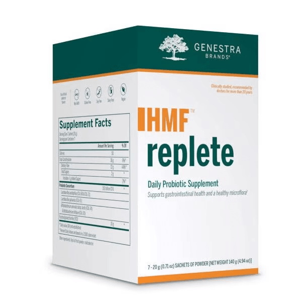 HMF Replete is a unique combination of proprietary human-sourced probiotics that supports a healthy intestinal microflora. The intestines contain more than 400 bacterial species, and bacterial balance is necessary for a healthy intestinal tract. Probiotics, including Lactobacillus and Bifidobacterium, promote healthy microflora, support normal intestinal microbiota, and promote digestive health. In a randomized, placebo-controlled trial involving 52 adults, daily probiotic supplementation supported gastrointestinal health.